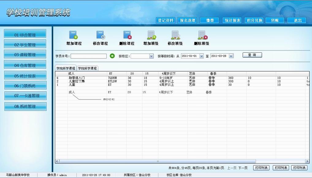 市场上同类型的软件功能很多,结构繁琐,都不是客户需要的,未站在客户的角度去解决问题,很多功能客户基本永远都不会用到或很少用到。南京惠施公司针对这种情况,自主研发了一套完全以用户角度出发,解决用户实际问题为导向的系统。目标是解决培训管理学校90%以上的工作量,实现以较少操作,完成大部分工作的目标。 惠施培训管理系统基于WCF/WPF是真正的网络版C/S管理系统,操作方便,功能强大,在全国目前所有同类型产品中名列前茅。完全能够解决多个城市、多个分校情况下的,学校综合管理功能;也能解决小型培训中心管理功能。系统可扩展性非常高,并且能根据客户的需求做功能定制开发。 本系统为培训学校提供了一个稳定、高效、快捷的管理工具,将大大减轻员工、领导、学员负担,能够促进学校教育管理的专业化和理性化,全面提高培训学校管理的质量与效益,为培训学校管理节省大量的人力、物力,促进培训学校管理与教学的全面升级,实现科学、高效、轻松地管理。 站在客户角度解决实际问题,减少管理工作!享受科技! 适用范围: 各种辅导班学校、外语培训学校、电脑培训学校、综合培训学校、在多个省市有多个分校区分大型培训学校、高初小培训学校、职业培训学校等。 功能列表:(具体请见图示或联系试用) 课程管理、学员管理、班级配置、教师管理、用户管理、教室管理。 报名、缴费、资料登记、学员领书、积分兑换、成长卡兑换、免费、赠送、退费、转报 仓库管理、库存初始录入、出库、入库、调货、库存月报表、库存状态卡、书籍磁带练习册能设置成套,也可分开销售、仓库配置。 一次报多门课程、一次购买多本书籍,一次打印多个课程听课证、多个课程一次性收费等等。 当日收费日报表、培训日报表、书库日变化表、书库周报表、书库月报表、整体书库报表、每周退学、退书一览表随时打印 退费一览表、礼品兑换者名单表、礼品库存表、开课花名册、欠费一览表 年终按教师打印全年学生总额、缴费总额 年终按科目查询总人数、总金额 财务管理:收费、统计收费信息、账户金额、收费明细等 教师续保率表 书籍分项目属性(可自由设置)、季节(春夏秋冬)属性。 学费、资料费、空调费、优惠券、减课次、学费9 折、减免、账户预存金、学员考勤刷卡、员工考勤刷卡、登录日志 短信促销、提醒功能 网上查询考试成绩功能接口。 权限可自由设置,并含内部默认权限设置: 初次使用,管理员可以您自己学校的情况自由设置“权限类型”,对权限类型配置其含有的权限列表,再根据用户的职务情况配置其相应权限。也可以使用系统默认的权限设置。 系统默认权限情况: 前台报名:可录入、修改、查询学员信息(刷卡、智能搜索),可报名、可打印听课证、可进行积分管理 分校区负责人:可进行前台所有工作,可录入管理课程、可打印课前花名册、可办理退学、退费等。 收费员:可进行前台所有工作、可打印日报表、可打印收费小票 总负责:可打印所有报表、可查看各教学点日报表、查询学生信息含缴费记录、查询班级情况含缴费情况、查询教师含所有课程费用、查询课程情况含缴费情况、可备份、删除数据库等功能。 教务处:可根据学生名、IC卡号、电话查询学生信息、课程信息,不含缴费信息。可根据教师查询教学任课班级、开课日期、结课日期、分校区。可根据分校区查看课程。 管理员:可以管理员工信息、教职工信息、管理公告栏、分配权限、管理权限类型、查看、打印、导出Excel等等共。 所有人:查看公告栏(用于发布通知等内部信息)。 考勤记录:学员每天来校刷卡登记。员工考勤。 试用版本下载: (培训学校管理系统试用版本下载) 培训管理系统安装说明下载::培训管理系统安装说明(右键另存为) XP操作系统需要安装FrameWork3.5,下载地址::http://www.an1818.com/tmp/DotNetFX35 | 登录 |  | | 管理系统首页 |  | | 刷卡后报名选课 |  | | 可以一次报多门课程 |  | | 也可以单独增加一本书籍 |  | | 自动选择书籍、课程和费用等 |  | | 某一本书学员不要的可删除,也可另增等 |  | | 单独购买书 |  | | 学员缴费,支持欠费,补款、预付等方式 |  | | 积分兑换 |  | | 学员领书自动关联库存,领出套装的子册自动出库 |  | | 统计报表 |  | | 一卡通管理 |  | | 员工管理 |  | | 增加课程删除课程 |  | | 人员、课程、班级、物品都能根据拼音缩写,编号智能搜索 |  | | 培训日报表 |  | | 来访咨询统计 |  | | 咨询跟进录入 |  | | 来访咨询统计3 |  | | 来访咨询4 |  | | 咨询登记 |  | | 收费退费收据小票 |  | | 控制打印选择项 |  | | 所有报表都能导出Excel文件 |  | | 每个班级花名册(其他报表类似,不累赘复述) |  | | 刷卡上课、上学 |  | | 管理服务器 |  | | 如需详情请联系公司咨询,可提供试用版本! |